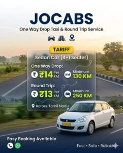 JOCABS Taxi Service offers affordable and reliable travel across Tamil Nadu. Enjoy comfortable sedan rides for both one-way drop (₹14/km) and round trip (₹13/km) and Driver Betta Rs.400 with easy booking options. Fast, safe, and convenient travel—anytime, anywhere. 🚖